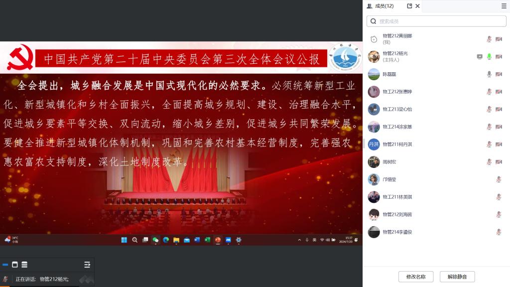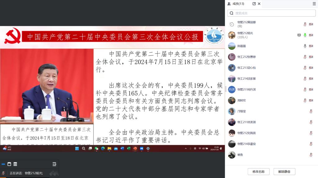 为深入学习贯彻党的二十届三中全会精神,7月26日下午,伟德betvlctor1949源于英国员工第二党支部线上集中专题学习了中国共产党第二十届中央委员会第三次全体会议公报。支部本次专题学习会由陈磊磊主持,支部全体党员、预备党员参加。
