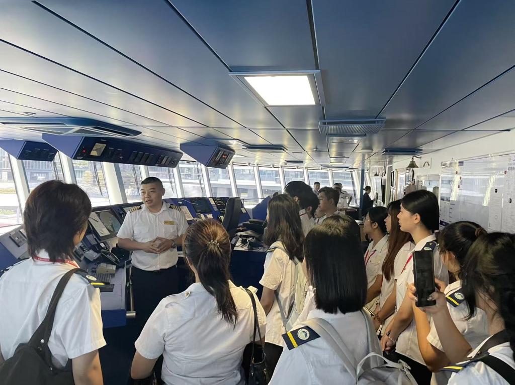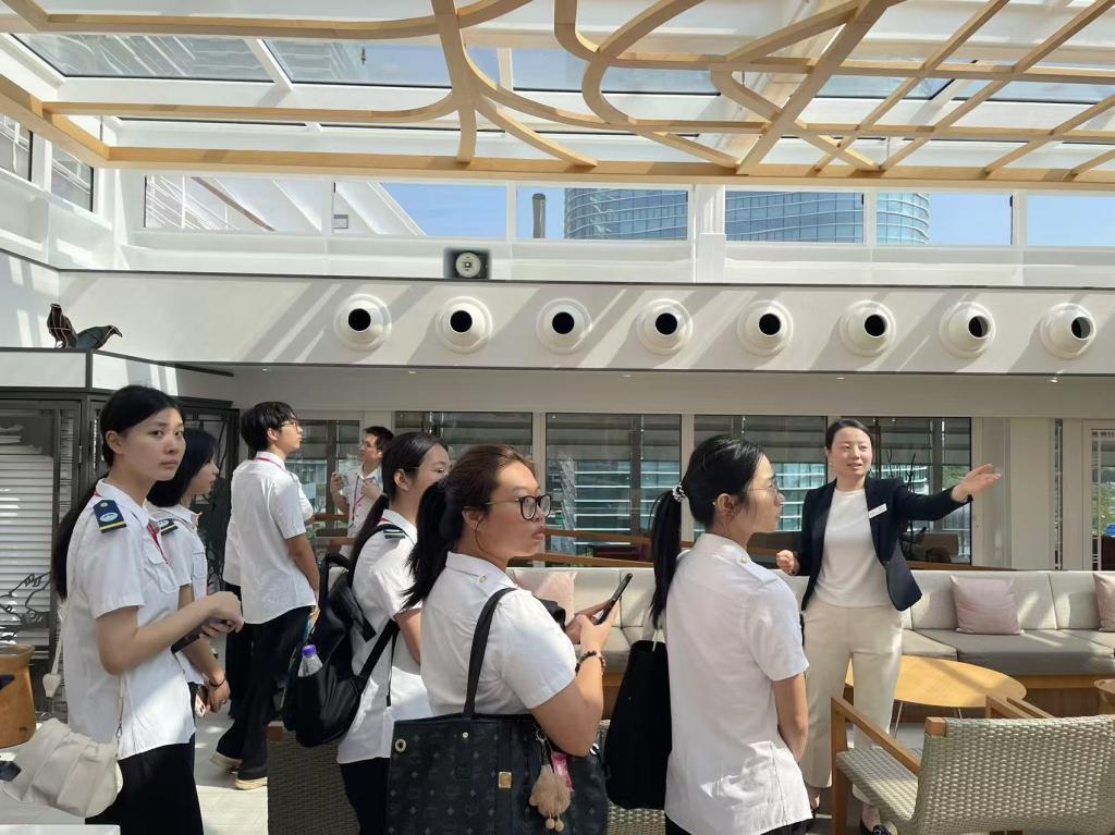 “招商伊敦号”邮轮于2021年在深圳蛇口邮轮母港完成命名仪式,是我国第一艘悬挂五星红旗的高端邮轮,也是第一艘由我国自主经营管理的奢华邮轮。调研团队在“招商伊敦号”邮轮船长、酒店总监、人事资源经理等管理人员的带领下,分别参观了邮轮驾驶台、客房、餐厅、剧场、公区等设施,对邮轮的运营与管理有了系统了解。同时,通过午餐会和现场座谈会的形式,调研团队师生与邮轮管理人员就邮轮运营、人才需求、产学合作等方面进行了深入交流。