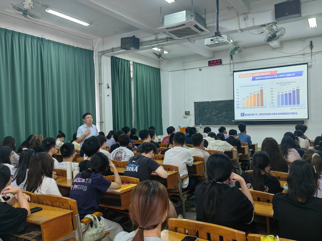 9月18日,海事法律与交通公司党委书记贾文武在琶洲校区教学楼,为物流管理251、252班全体新生带来题为“从教育大国迈向教育强国”的思政第一课。