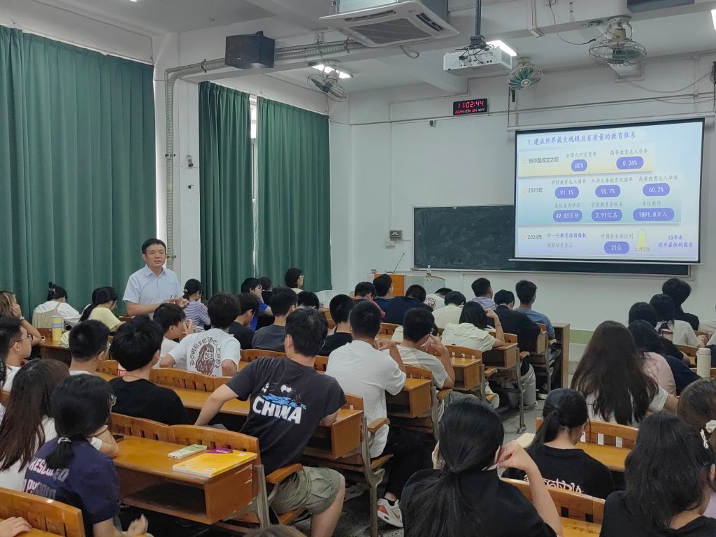 课程尾声,贾文武以“教育兴则国家兴,教育强则国家强”深情勉励新生:“我们要锚定2035年建成教育强国的目标,努力奋斗,跑好历史的接力棒!书写以教育强国建设支撑引领中国式现代化的时代新篇章。” 新生们纷纷表示,这堂思政课让自己明确了专业价值与时代使命,未来将以更饱满的热情投入学习,争做有理想、敢担当、能吃苦、肯奋斗的新时代青年。