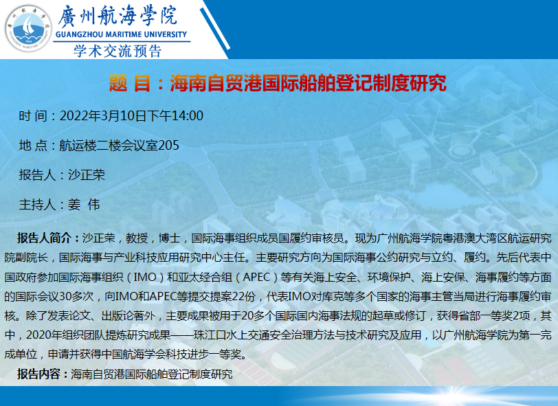上一条:孙战秀博士举行讲座预告 下一条:学术讲座预告:关于广州港南沙四期自动化码头建设的实践与启示