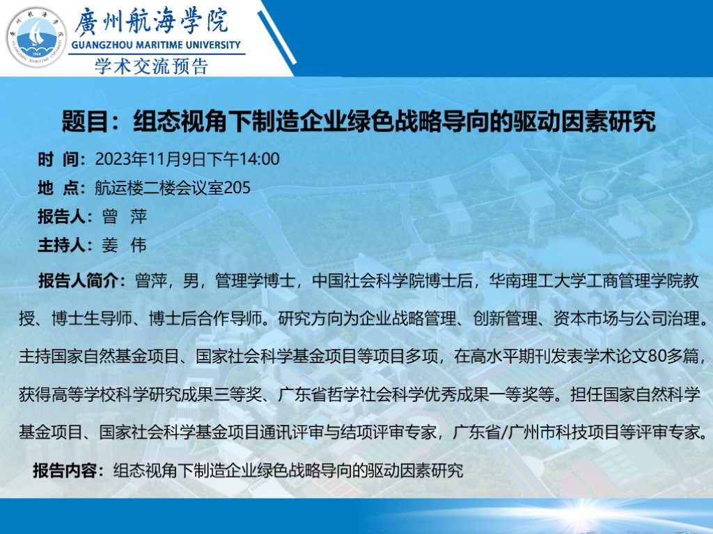 上一条:余沛副教授讲座预告 下一条:学术讲座预告:关于广州港南沙四期自动化码头建设的实践与启示
