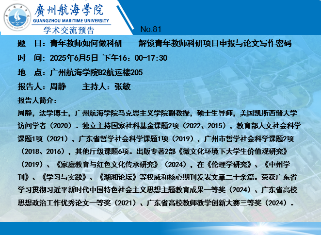 上一条:学术讲座预告:刘嘉麒院士《漫谈地球科学》 下一条:学术讲座预告:关于广州港南沙四期自动化码头建设的实践与启示
