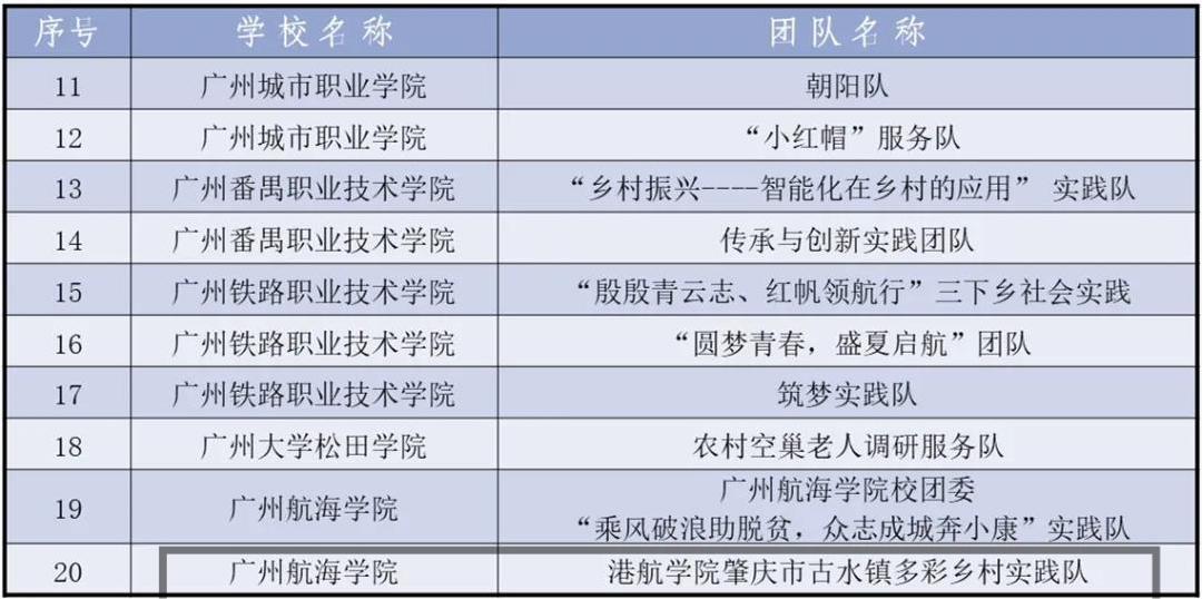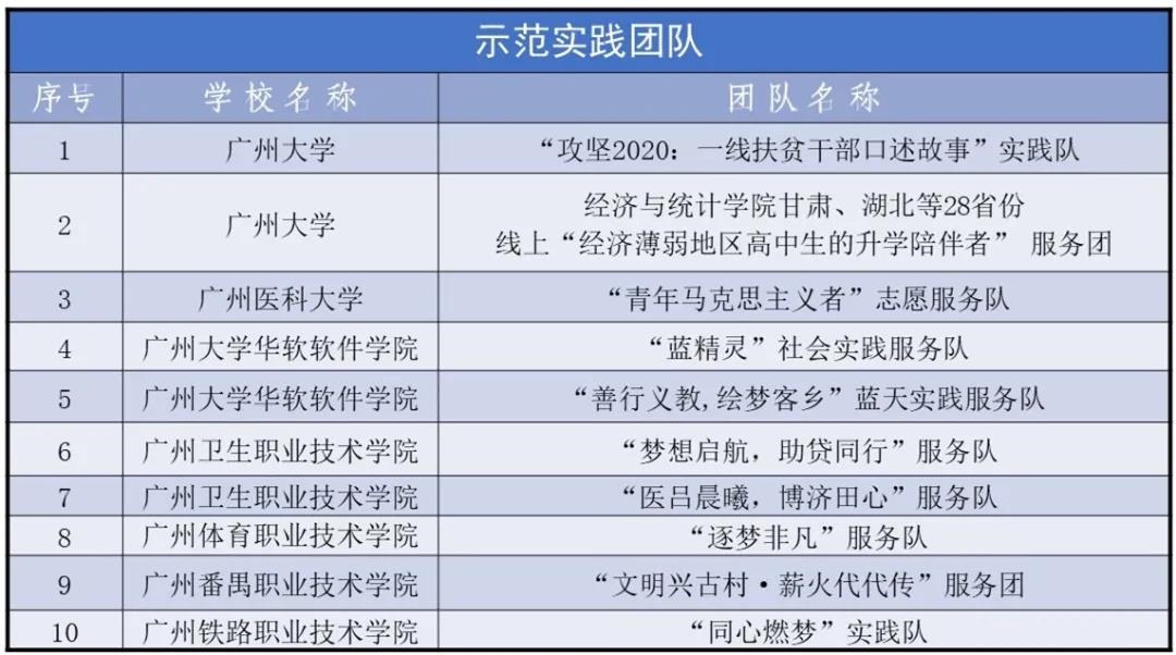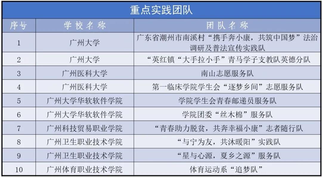 根据《关于开展2020年广州市大中专员工志愿者暑期文化科技卫生“三下乡”社会实践活动的通知》要求,经市属高校初评推荐,市学联秘书处电话调查及复评,学少部审核,已产生2020年广州市老员工志愿者暑期文化科技卫生“三下乡”社会实践活动优秀团队59个,其中示范实践团队10个,重点实践团队20个,优秀实践团队29个,现将名单予以公示。