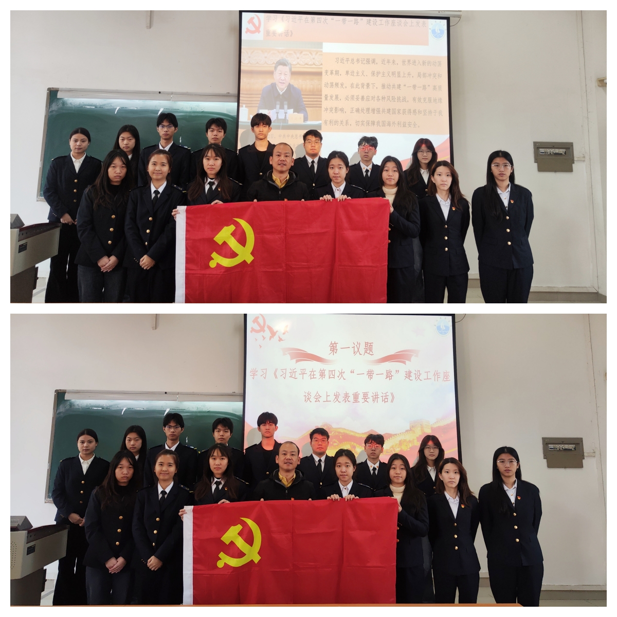 本次党课分为三个部分进行。首先,落实“第一议题”制度:学习《习近平在第四次“一带一路”建设工作座谈会上发表重要讲话》。12月2日,第四次“一带一路”建设工作座谈会在北京召开。会上,习近平总书记发表重要讲话时强调,在当前严峻复杂的国际环境下,推动共建“一带一路”高质量发展机遇和挑战并存,但总体上机遇大于挑战。我们要坚定战略自信,保持战略定力,勇于担当作为,开创共建“一带一路”更加光明的未来。在世界进入新的动荡变革期,单边主义、保护主义明显上升,局部冲突和动荡频发背景下,推动共建“一带一路”高质量发展,必须妥善应对各种风险挑战,有效克服地缘冲突影响,正确处理增强共建国家获得感和坚持于我有利的关系,切实保障我国海外利益安全。