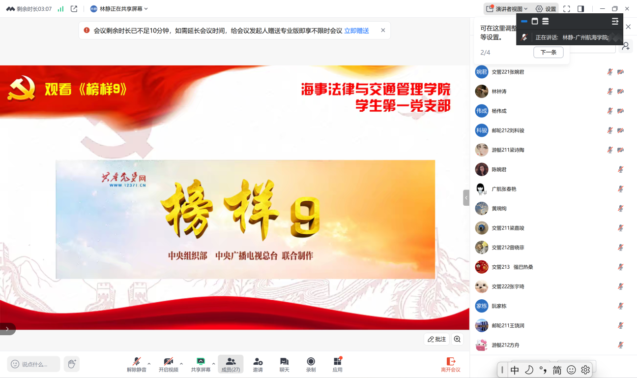 其次,党支部同志们集中观看了《榜样9》,该节目邀请范振喜、钱素云、覃大清、陈清洲、刘小京、黄德宽、林则银7名党员和山东青岛新前湾集装箱码头公司党委、陆军某边防团红其拉甫边防连参加录制,通过现场访谈、重温入党志愿书等形式,向观众生动讲述他们的先进事迹,彰显基层党组织战斗堡垒作用和共产党员先锋模范作用,支部党员通过观看《榜样9》视频,深入了解了这些优秀代表的先进事迹和崇高精神,感受到了榜样的力量。